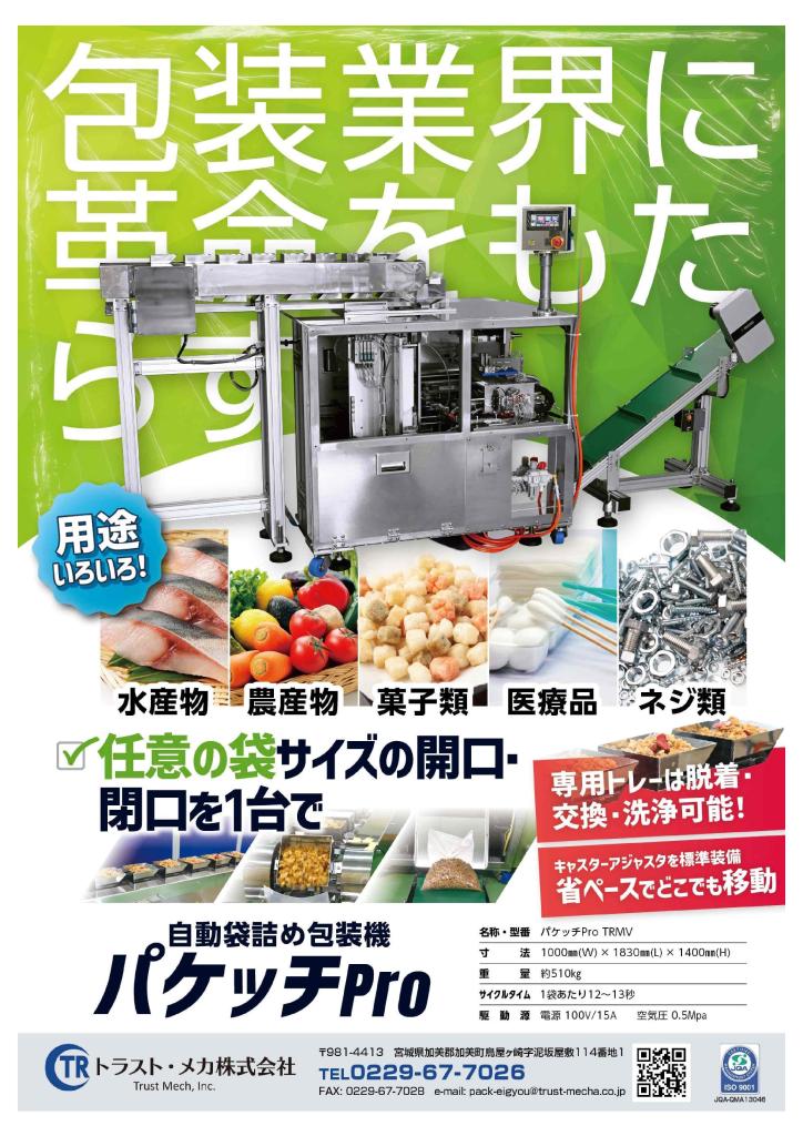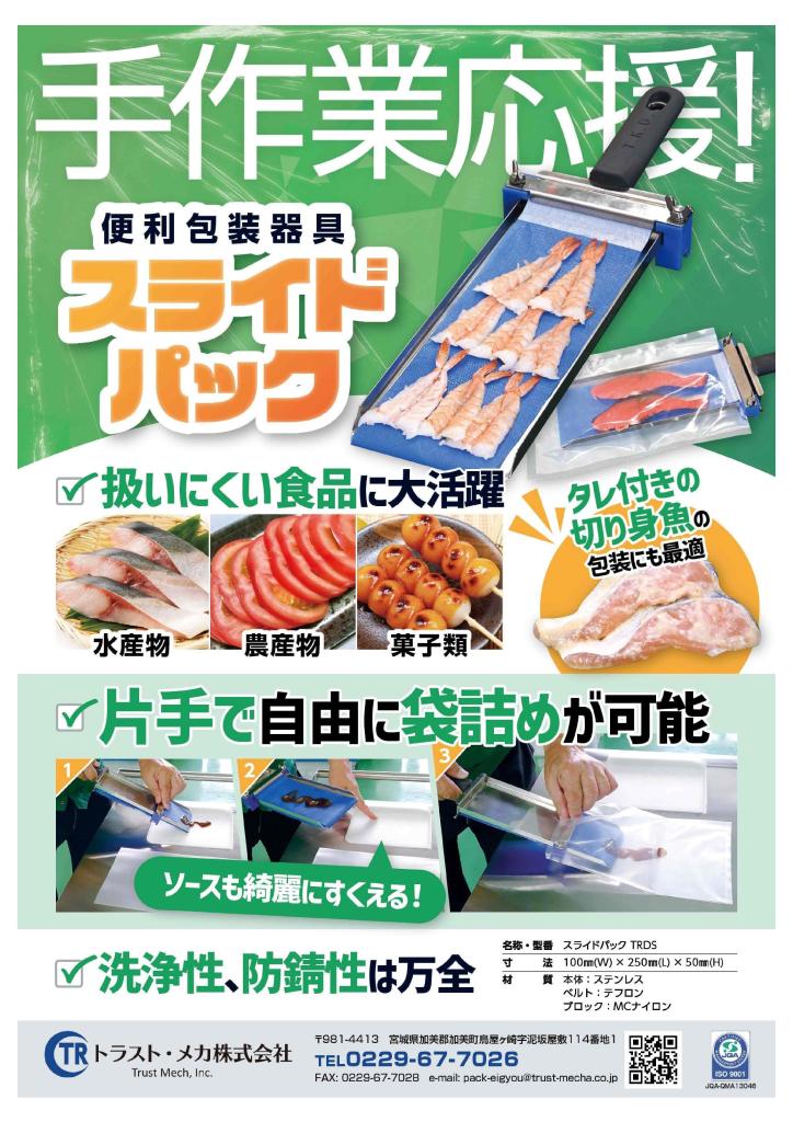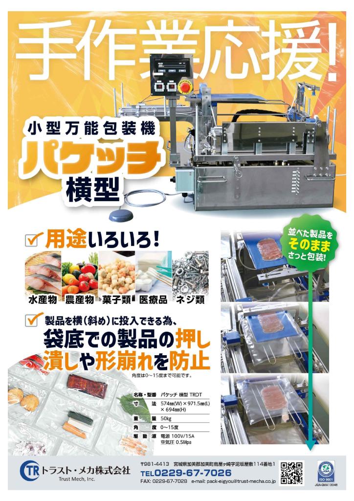 小型万能包装機「パケッチ」標準縦型、横型 便利包装器具「スライドパック」のデモ機を使い作業の実演をします。 |