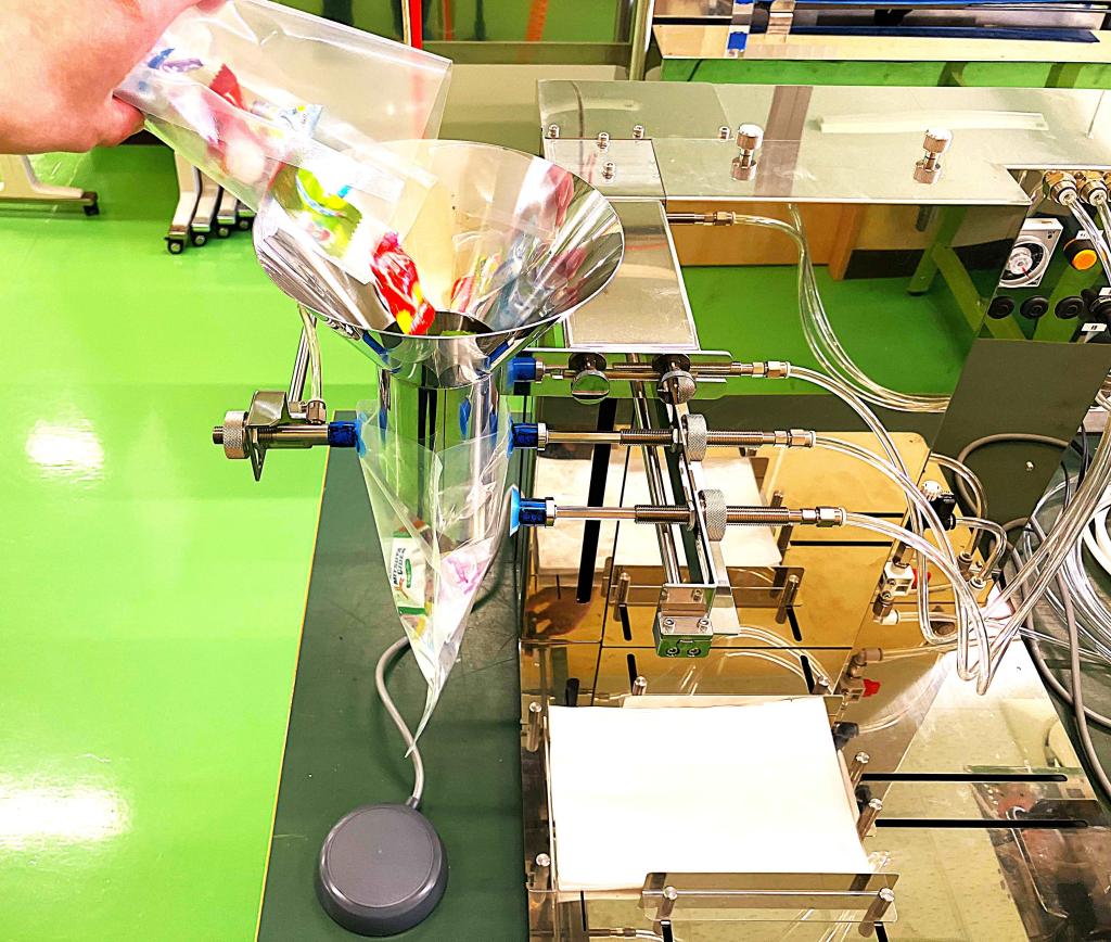 さまざまな用途の袋詰め作業に対応可能。袋の開口部を自動で開いて待機し、中身の投入を繰り返し行える画期的な機械です。人手不足でお悩みの袋詰め作業を省力・省人化します。